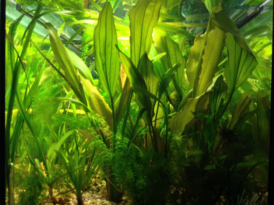 Echinodoren wachsen natürlich in so einen Aquarium viel schneller ( geringe Höhe dadurch besseres Licht, und durch die Stängelpflanzen achte ich natürlich mehr auf die optimale Düngung der Pflanzen), deswegen muß sie umziehen. Die großen Blätter werfen zu viel Schatten